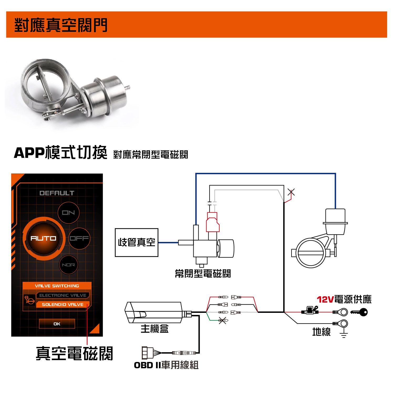 - - 自動模式透過連接OBDII,依APP設定時機自動切換閥門。